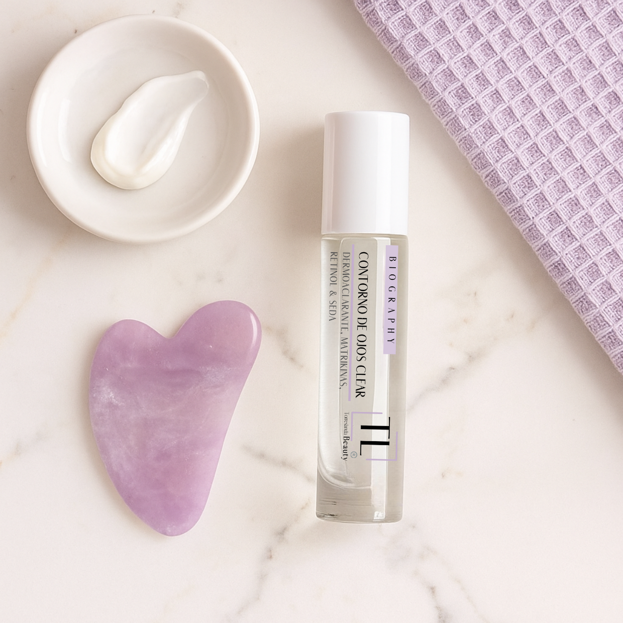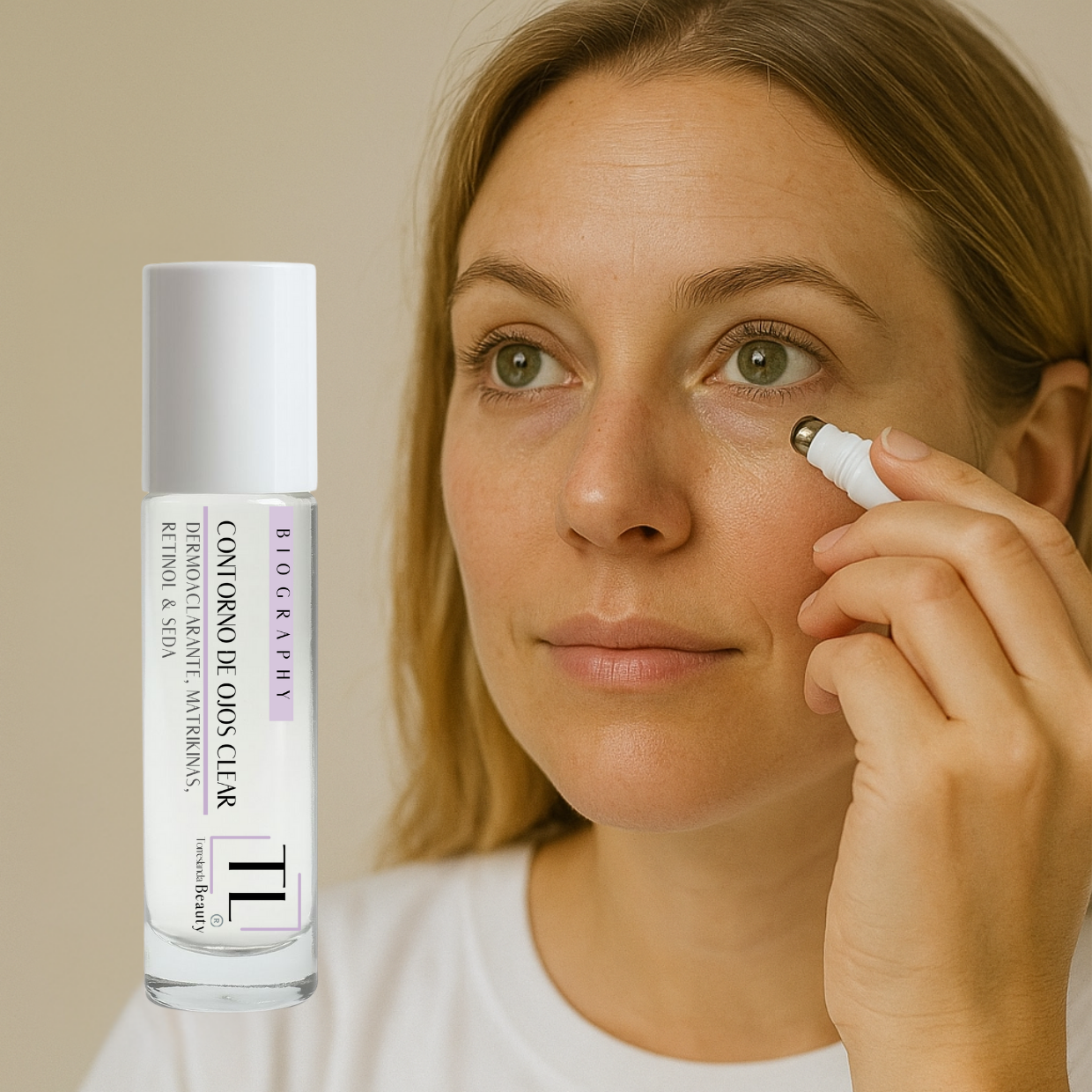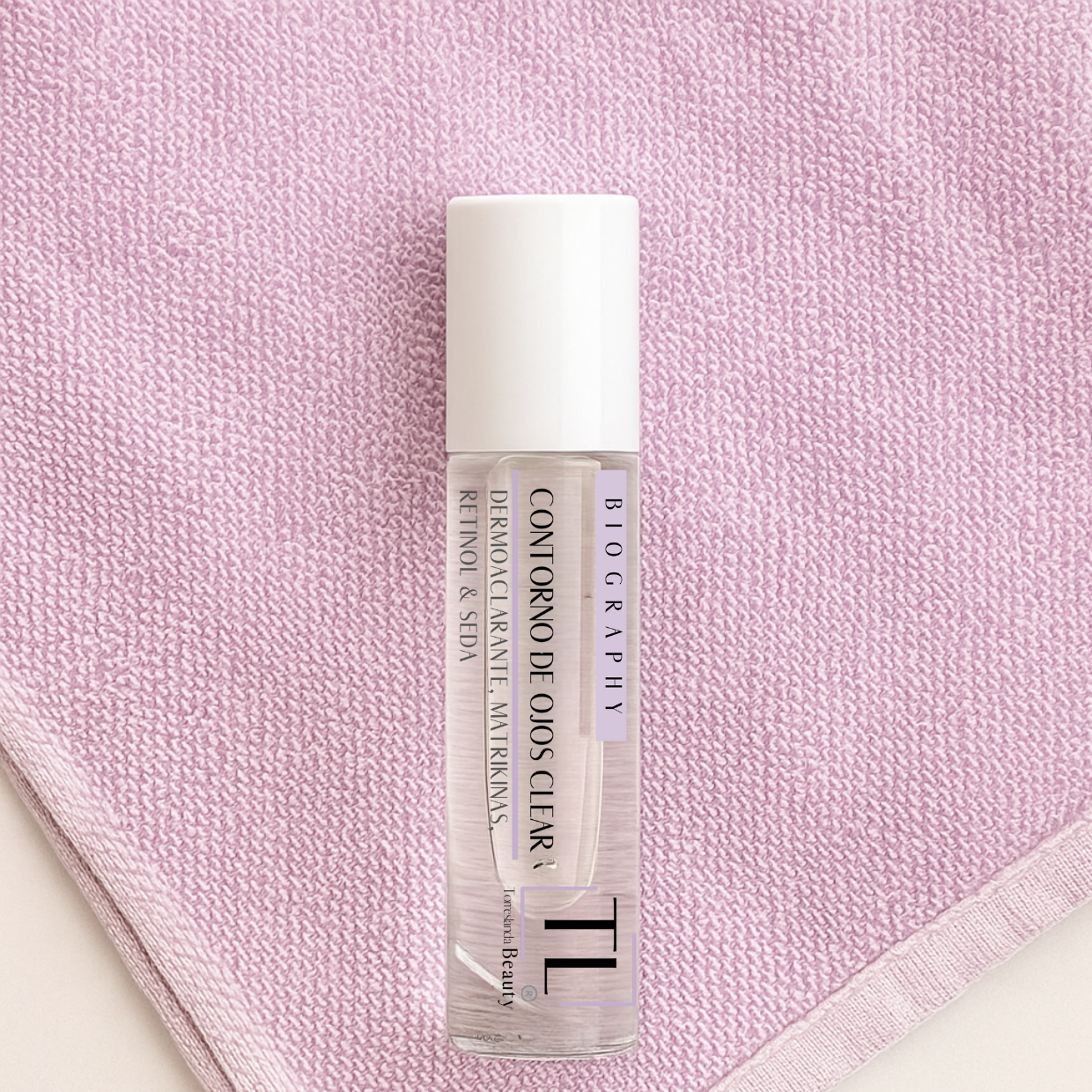 Clear combina un complejo dermoaclarante, matrikinas (péptidos de señal) y un toque de retinol acompañado de seda cosmética para lograr una mirada que se percibe más nítida y suave. Se absorbe rápido, no pesa y trabaja en silencio cuando eres constante. Menos ruido, más definición: claridad que se nota de cerca sin esfuerzo.